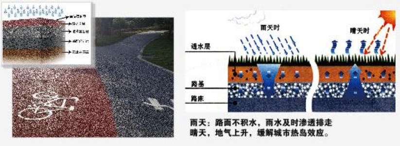 彩色透水地坪是一種新型的環保地坪,它擁有約20%孔隙,下雨時能夠快速補充城市地下水資源,并能吸收車輛行駛產生噪音,能減少地面陽光反射熱能,降低地面溫度,減少“熱島效應”。